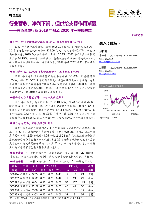 【光大证券】【20200505】有色金属行业2019年报及2020年一季报总结:行业营收、净利下滑,但供给支撑作用渐显-11页