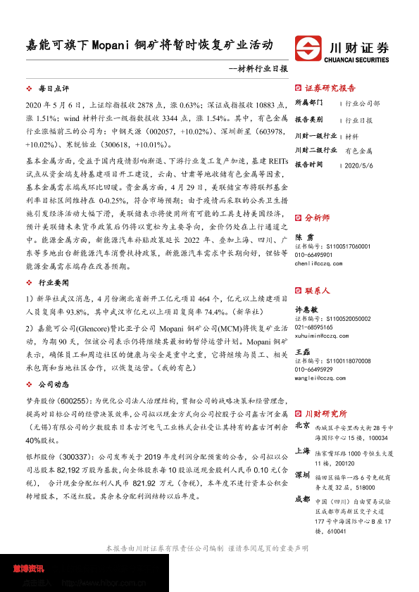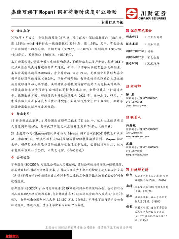 【川财证券】【20200506】材料行业日报:嘉能可旗下Mopani铜矿将暂时恢复矿业活动-3页