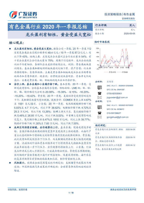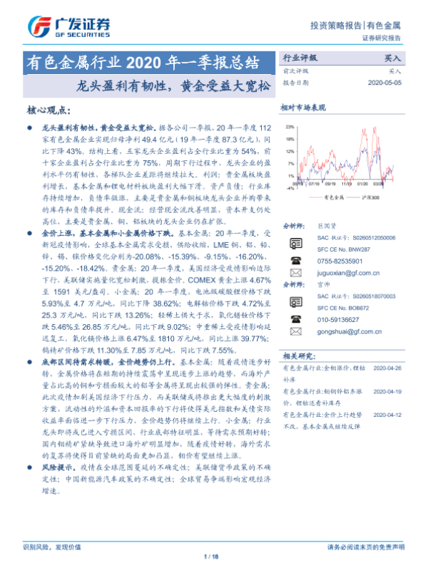 【广发证券】【20200505】有色金属行业2020年一季报总结:龙头盈利有韧性,黄金受益大宽松-18页