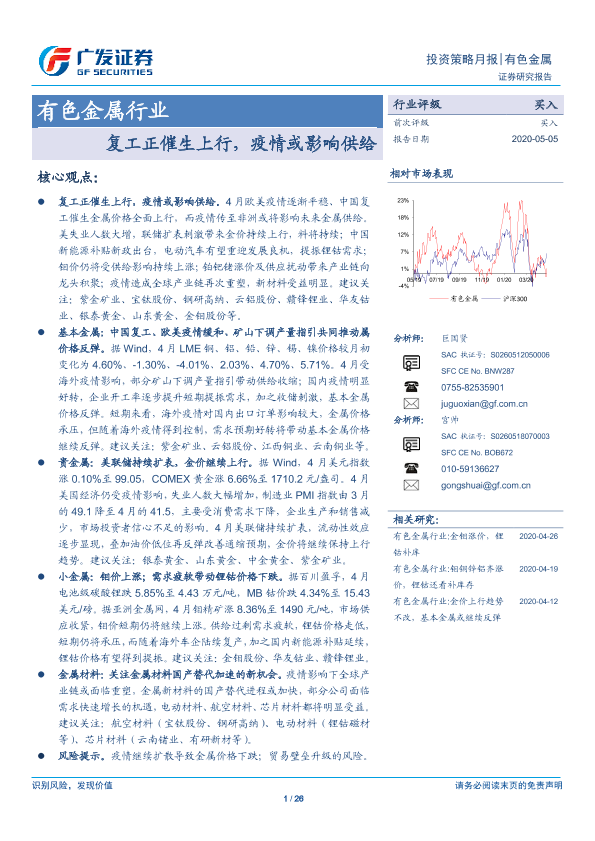 【广发证券】【20200505】20200505-广发证券-有色金属行业投资策略月报:复工正催生上行,疫情或影响供给-26页
