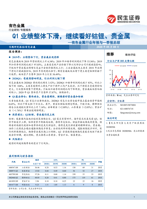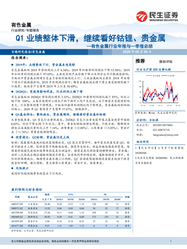 【民生证券】【20200508】20200508-民生证券-有色金属行业年报与一季报总结:Q1业绩整体下滑,继续看好钴锂、贵金属-20页