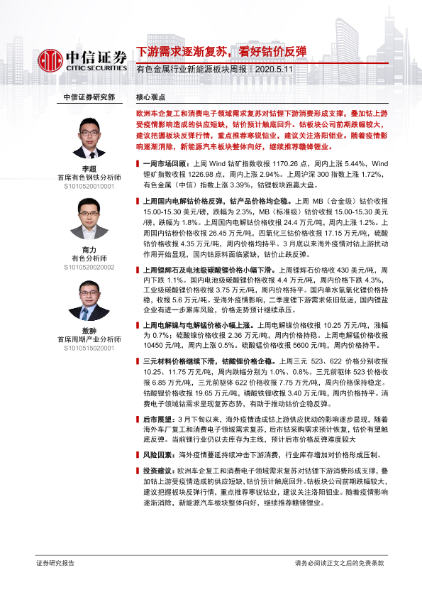 【中信证券】【20200511】20200511-中信证券-有色金属行业新能源板块周报:下游需求逐渐复苏,看好钴价反弹-14页