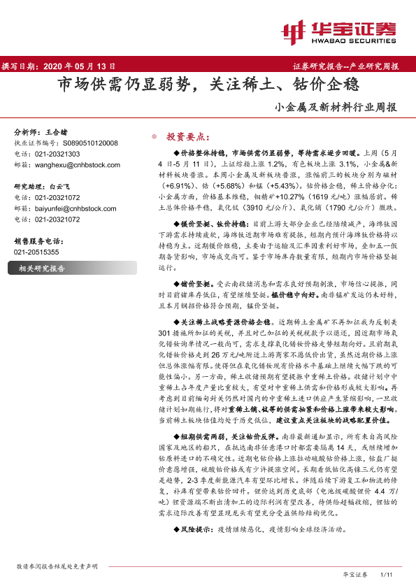 【华宝证券】【20200513】20200513-华宝证券-小金属及新材料行业周报:市场供需仍显弱势,关注稀土、钴价企稳-11页