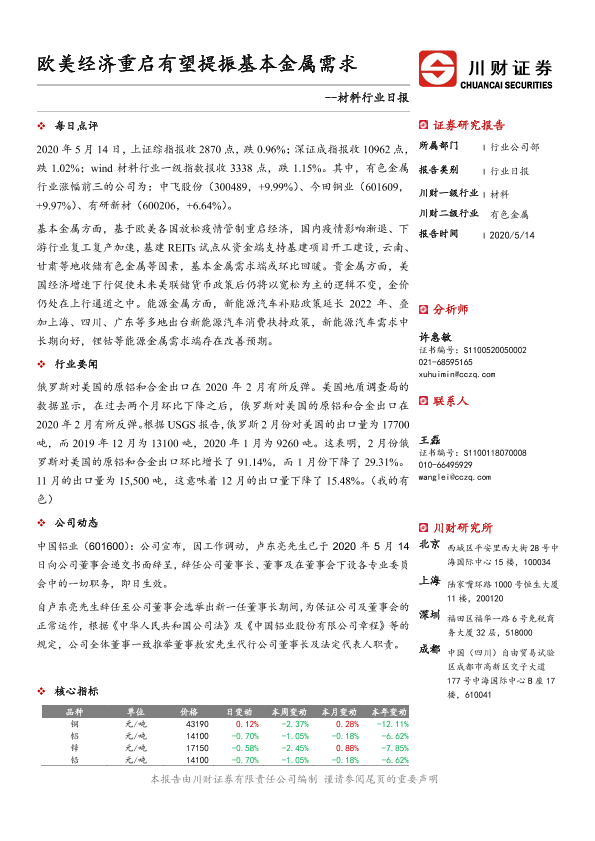 【川财证券】【20200514】材料行业日报:欧美经济重启有望提振基本金属需求-3页