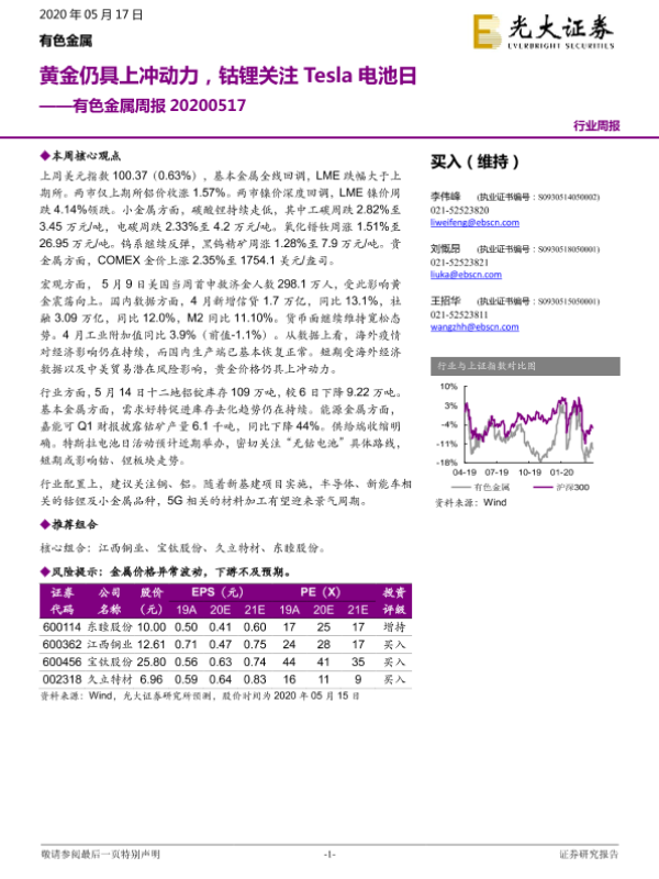 【光大证券】【20200517】20200517-光大证券-有色金属周报:黄金仍具上冲动力,钴锂关注Tesla电池日-14页