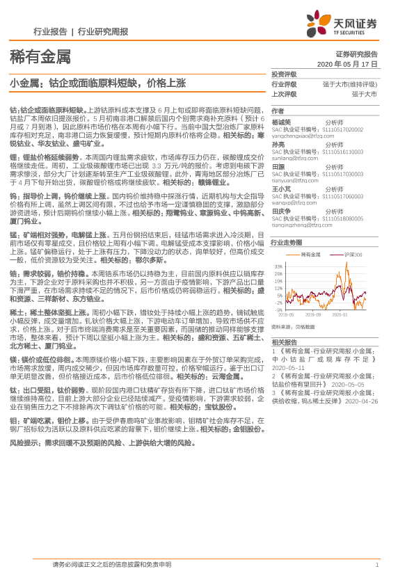 【天风证券】【20200517】20200517-天风证券-稀有金属行业研究周报:小金属:钴企或面临原料短缺,价格上涨-16页