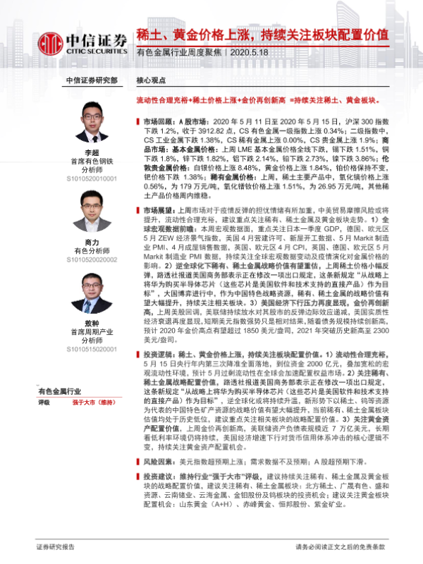 【中信证券】【20200518】20200518-中信证券-有色金属行业周度聚焦:稀土、黄金价格上涨,持续关注板块配置价值-17页