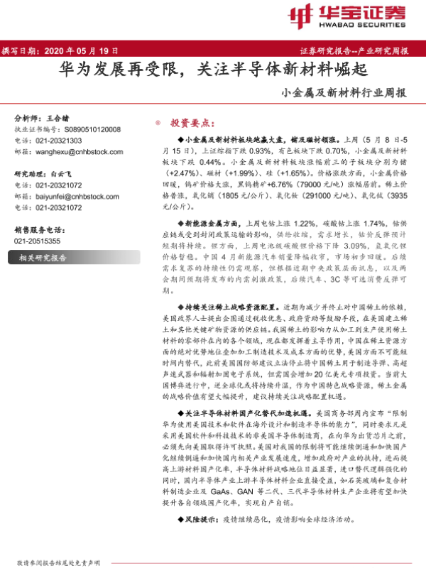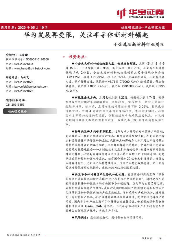 【华宝证券】【20200519】20200519-华宝证券-小金属及新材料行业周报:华为发展再受限,关注半导体新材料崛起-11页