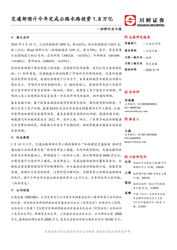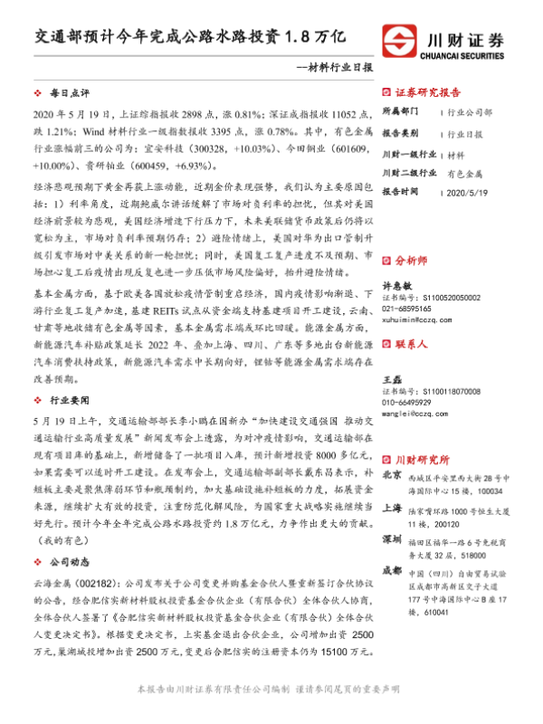 【川财证券】【20200519】材料行业日报:交通部预计今年完成公路水路投资1.8万亿-3页