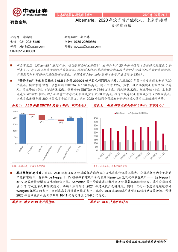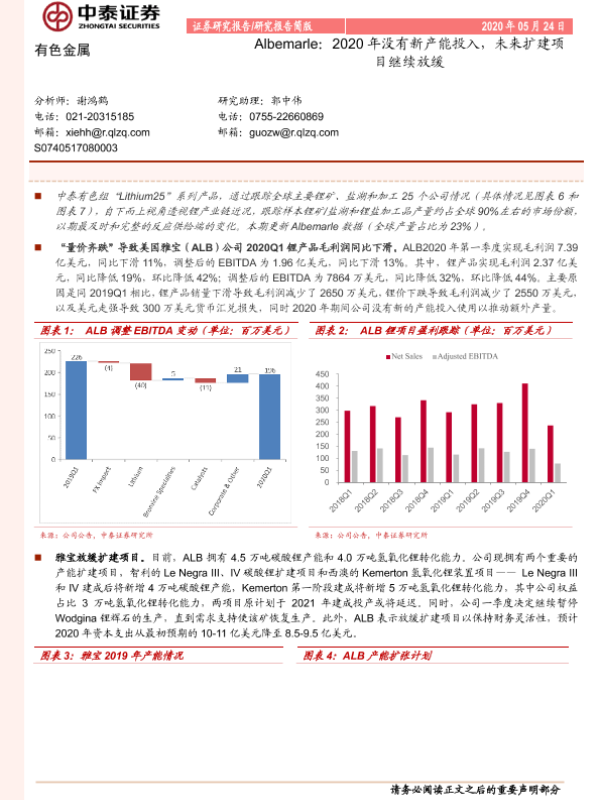 【中泰证券】【20200524】有色金属研究报告简版-Albemarle:2020年没有新产能投入,未来扩建项目继续放缓-5页
