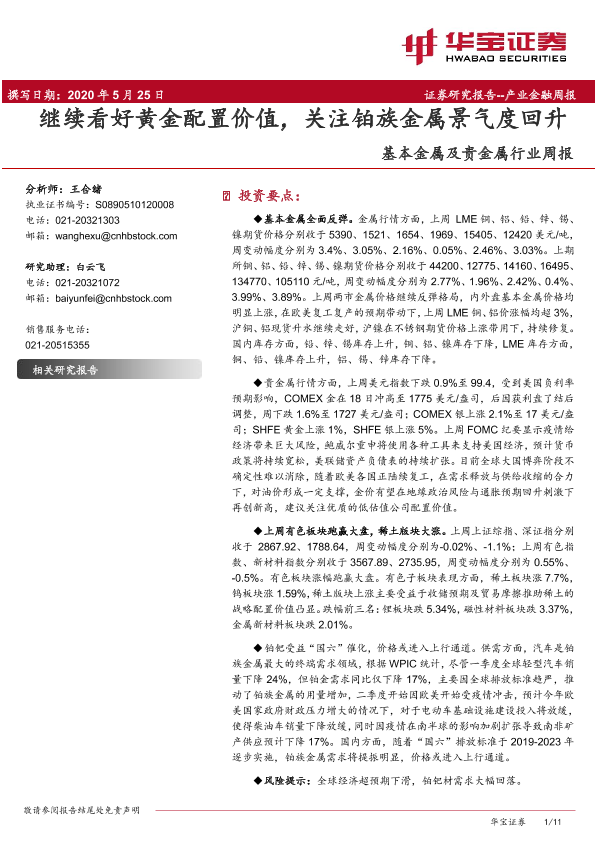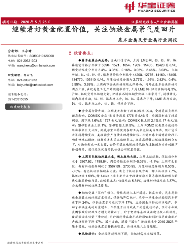 【华宝证券】【20200525】20200525-华宝证券-基本金属及贵金属行业周报:继续看好黄金配置价值,关注铂族金属景气度回升-11页