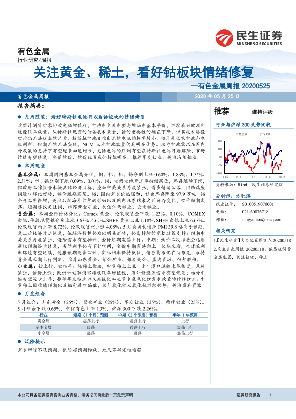 【民生证券】【20200525】20200525-民生证券-有色金属周报:关注黄金、稀土,看好钴板块情绪修复-18页