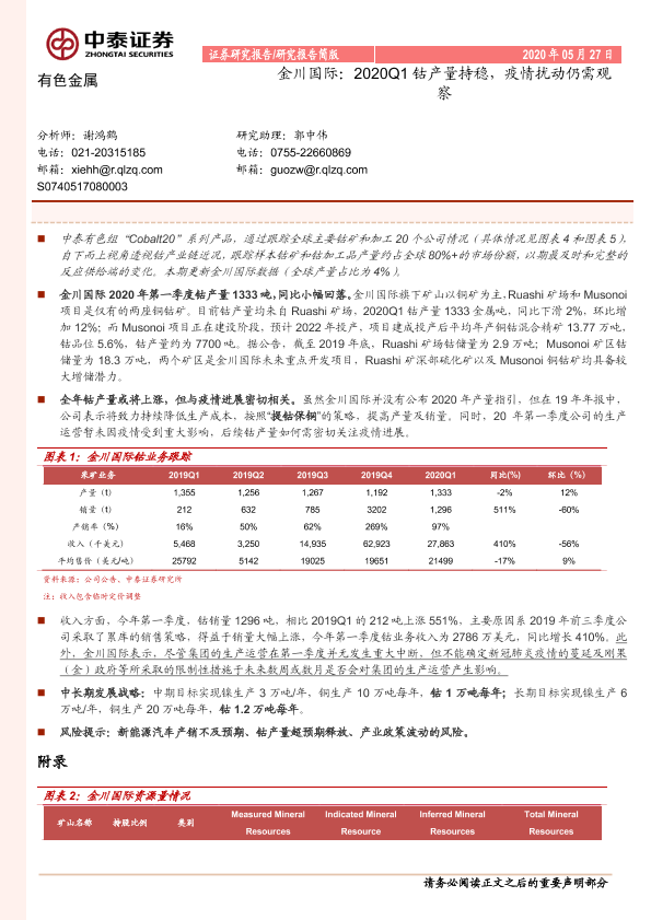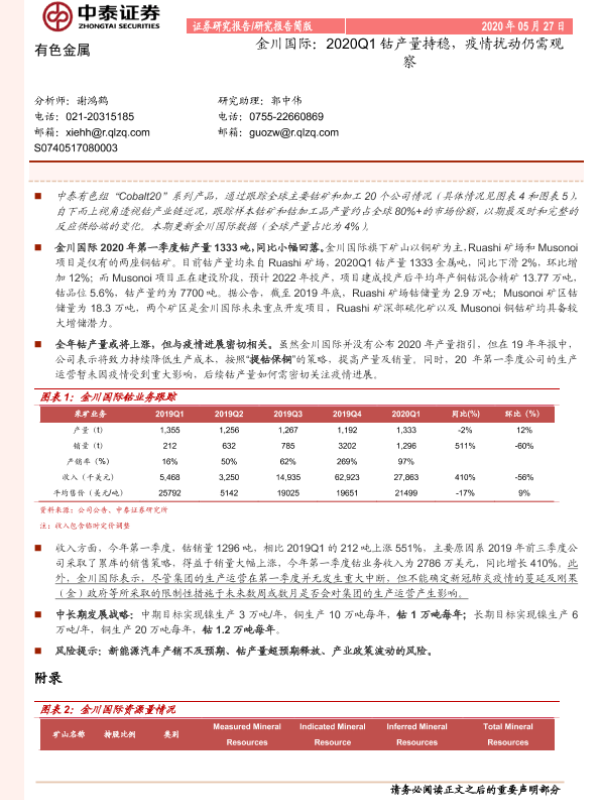 【中泰证券】【20200527】有色金属:金川国际:2020Q1钴产量持稳,疫情扰动仍需观察-4页