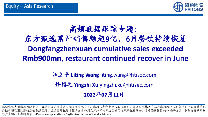 【海通国际】【20220711】高频数据跟踪专题:东方甄选累计销售额超9亿,6月餐饮持续恢复-35页