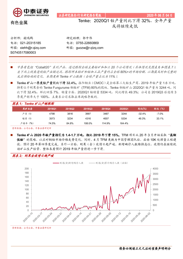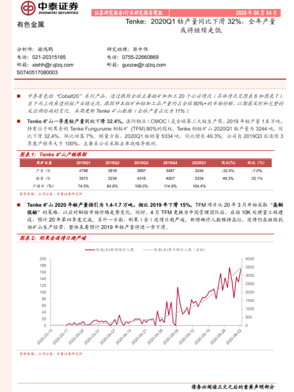【中泰证券】【20200604】20200604-中泰证券-有色金属行业研究报告简版:Tenke:2020Q1钴产量同比下滑32%,全年产量或将继续走低-4页