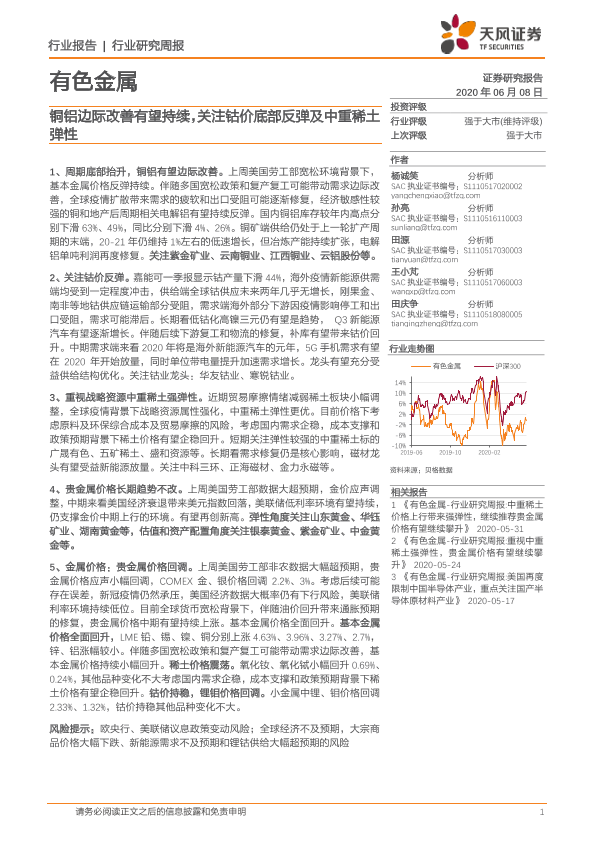 【天风证券】【20200608】20200608-天风证券-有色金属行业研究周报:铜铝边际改善有望持续,关注钴价底部反弹及中重稀土弹性-12页