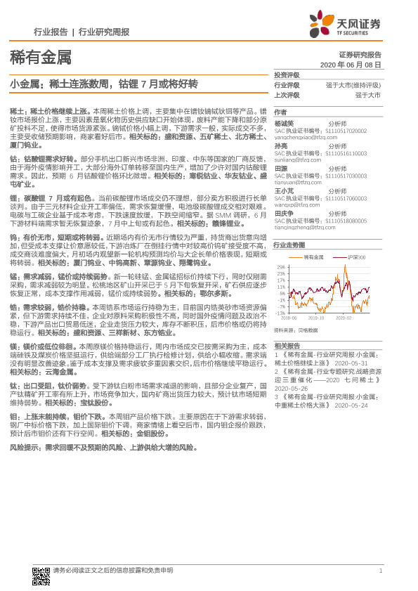 【天风证券】【20200608】20200608-天风证券-稀有金属行业研究周报:小金属:稀土连涨数周,钴锂7月或将好转-16页