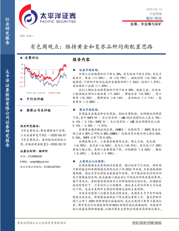 【太平洋证券】【20200614】有色周观点:维持黄金和复苏品种均衡配置思路-4页
