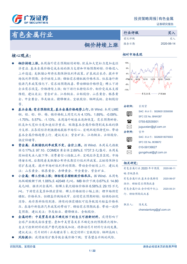 【广发证券】【20200614】20200614-广发证券-有色金属行业投资策略周报:铜价持续上涨-22页