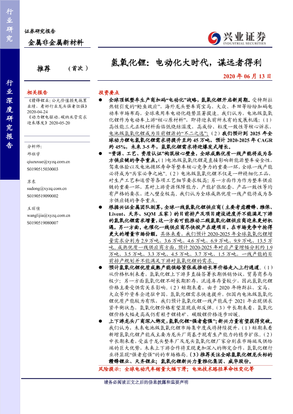【兴业证券】【20200613】氢氧化锂:电动化大时代,谋远者得利-50页
