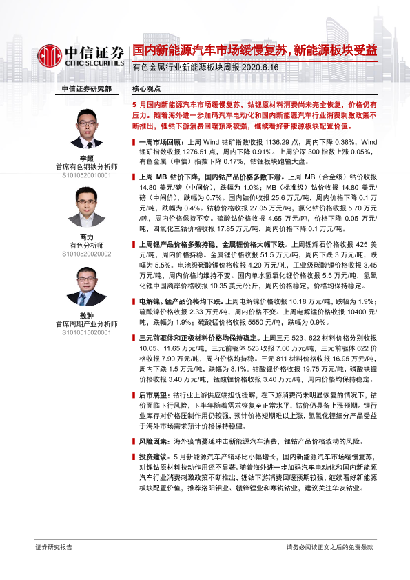 市场复苏 投资建议 新能源汽车 有色金属 钴锂价格