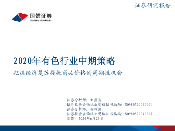 【国信证券】【20200621】2020年有色行业中期策略:把握经济复苏提振商品价格的周期性机会-32页