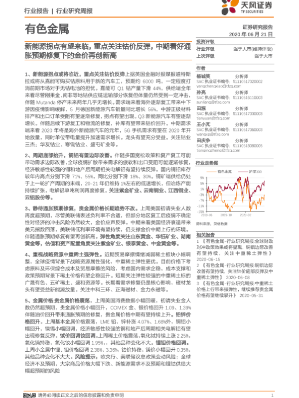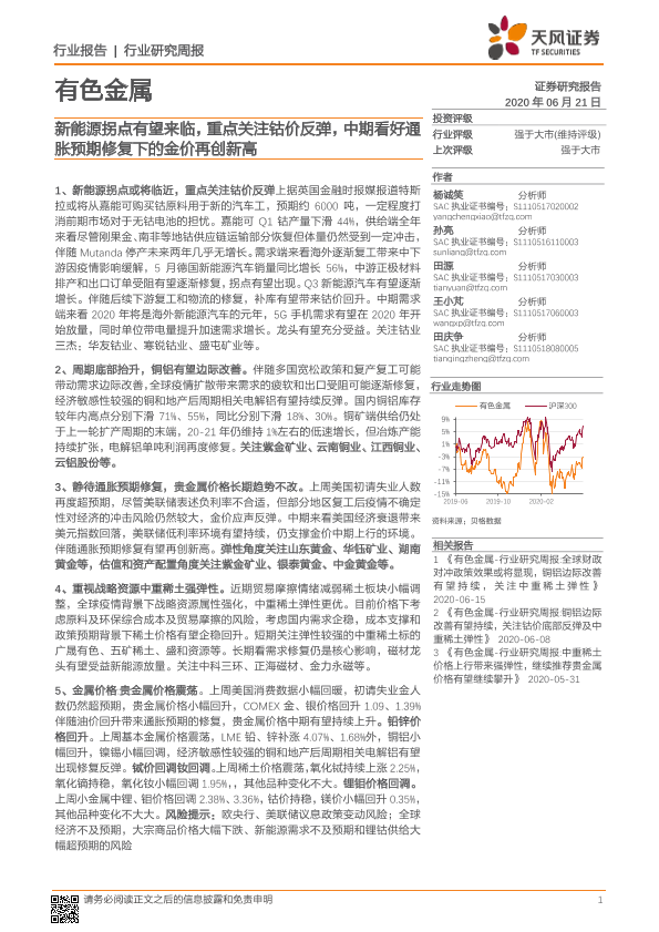 【天风证券】【20200621】20200621-天风证券-有色金属行业研究周报:新能源拐点有望来临,重点关注钴价反弹,中期看好通胀预期修复下的金价再创新高-12页