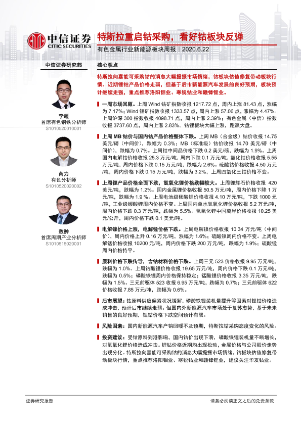 【中信证券】【20200622】20200622-中信证券-有色金属行业新能源板块周报:特斯拉重启钴采购,看好钴板块反弹-15页