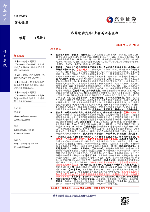 【兴业证券】【20200628】20200628-兴业证券-有色金属行业周报:布局电动汽车+贵金属两条主线-11页