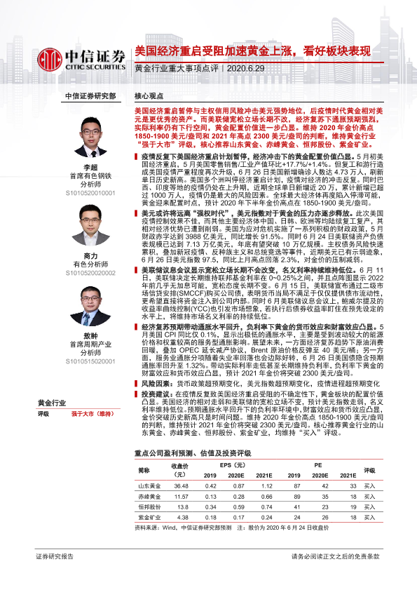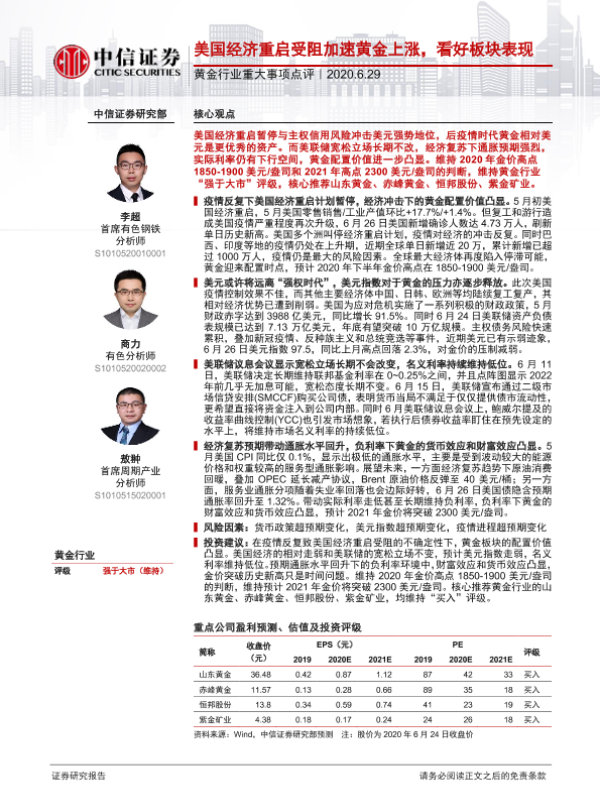 【中信证券】【20200629】20200629-中信证券-黄金行业重大事项点评:美国经济重启受阻加速黄金上涨,看好板块表现-2页