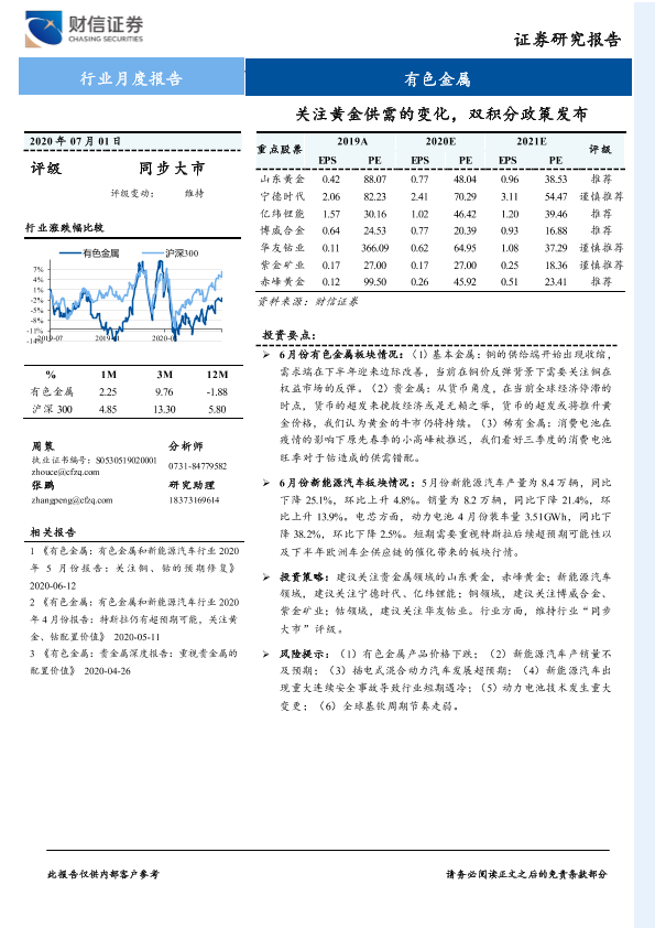 【财信证券】【20200701】20200701-财信证券-有色金属行业月度报告:关注黄金供需的变化,双积分政策发布-15页