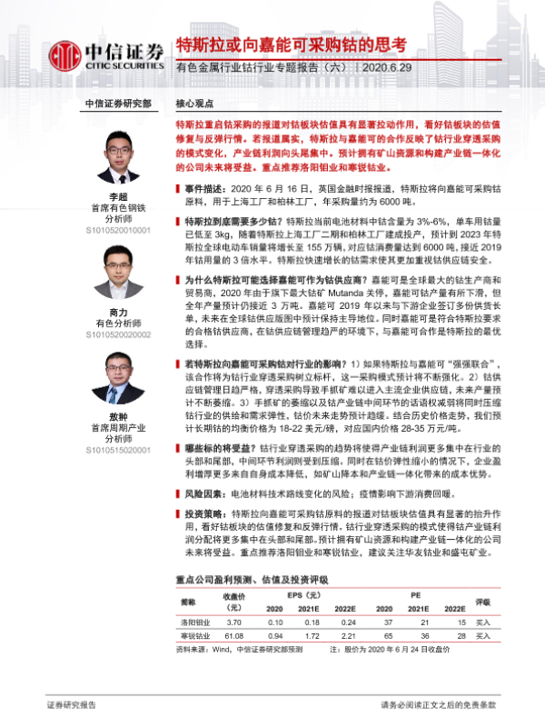 【中信证券】【20200629】20200629-中信证券-有色金属行业钴行业专题报告(六):特斯拉或向嘉能可采购钴的思考-19页