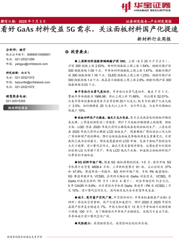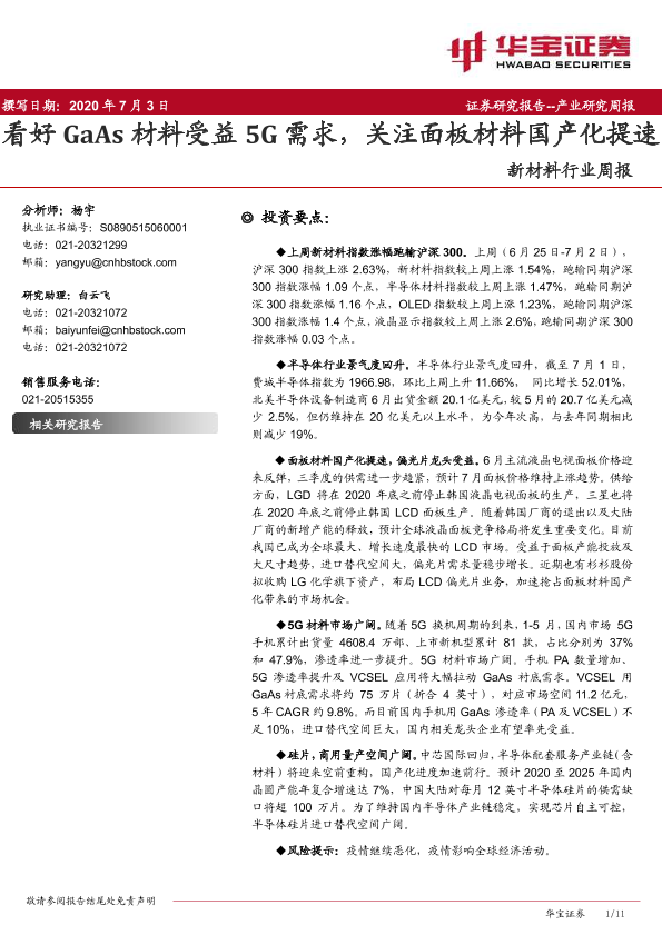 【华宝证券】【20200703】20200703-华宝证券-新材料行业周报:看好GaAs材料受益5G需求,关注面板材料国产化提速-11页