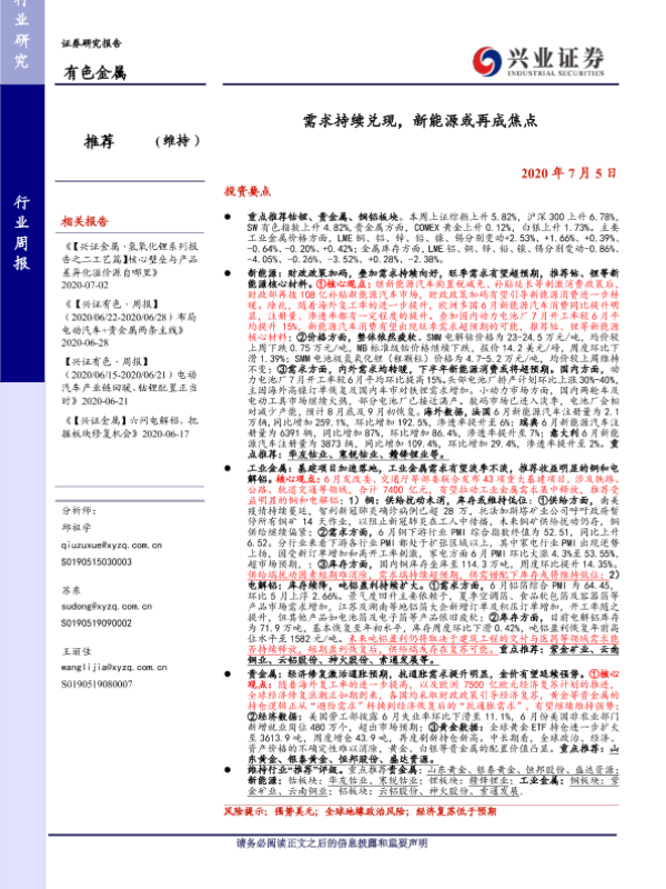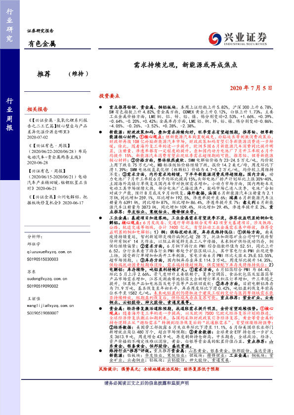 【兴业证券】【20200705】20200705-兴业证券-有色金属行业周报:需求持续兑现,新能源或再成焦点-12页