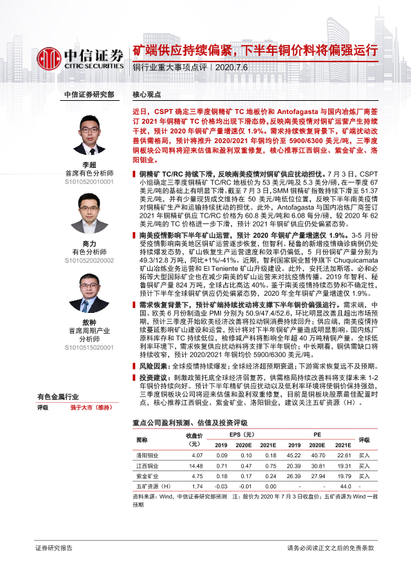 【中信证券】【20200706】铜行业重大事项点评:矿端供应持续偏紧,下半年铜价料将偏强运行-2页
