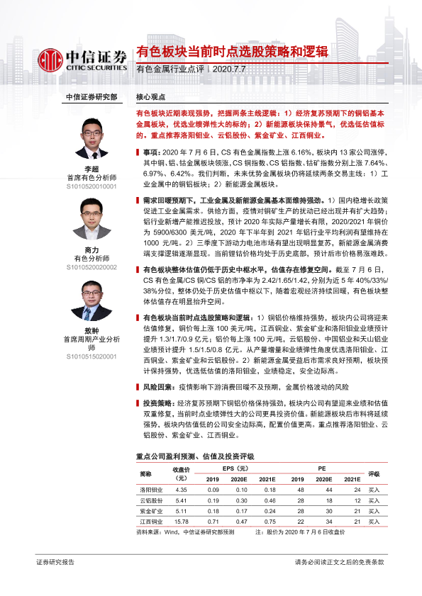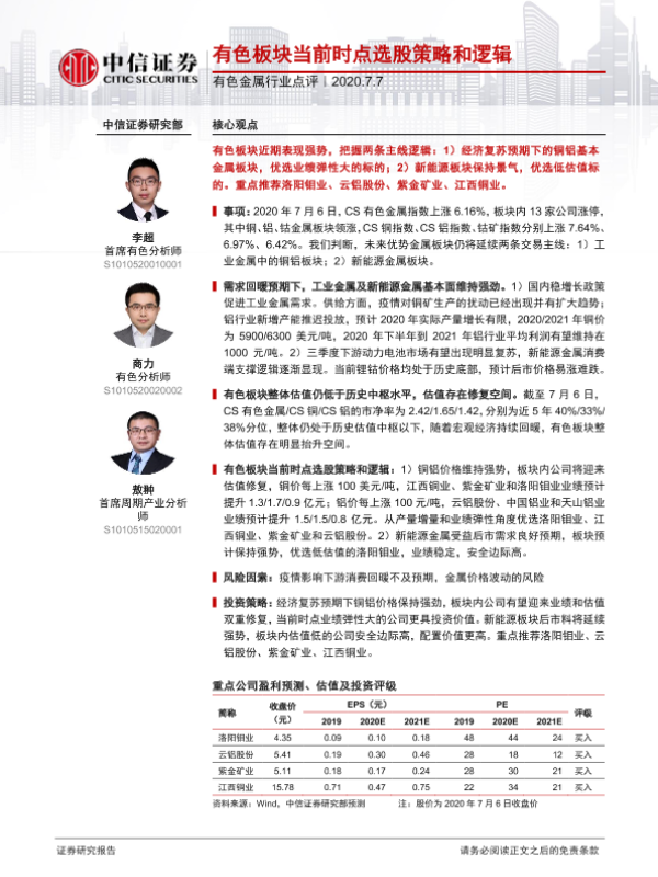 【中信证券】【20200707】20200707-中信证券-有色金属行业点评:有色板块当前时点选股策略和逻辑-3页