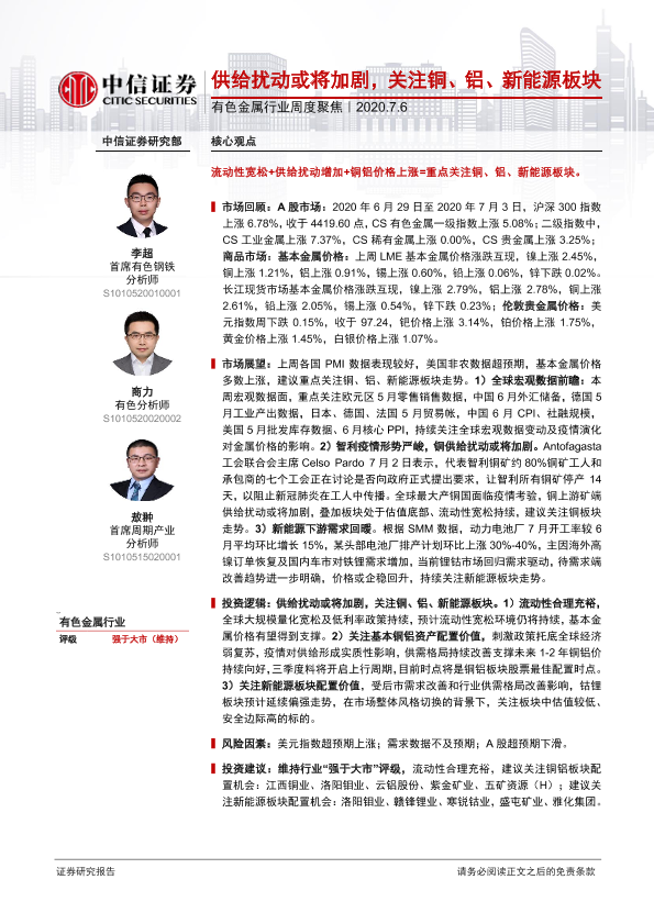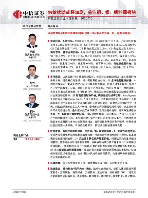 【中信证券】【20200706】20200706-中信证券-有色金属行业周度聚焦:供给扰动或将加剧,关注铜、铝、新能源板块-17页