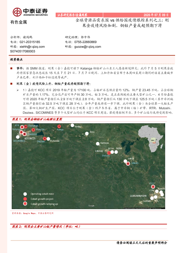 【中泰证券】【20200709】全球资源品需求国vs供给国疫情跟踪系列之三:刚果金疫情风险加剧,铜钴产量或超预期下滑-6页
