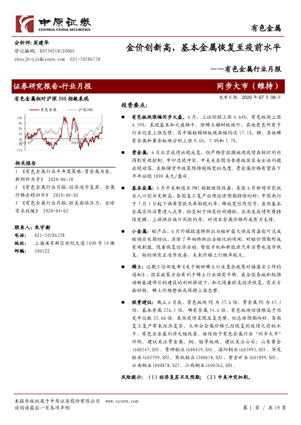 【中原证券】【20200706】20200706-中原证券-有色金属行业月报:金价创新高,基本金属恢复至疫前水平-19页