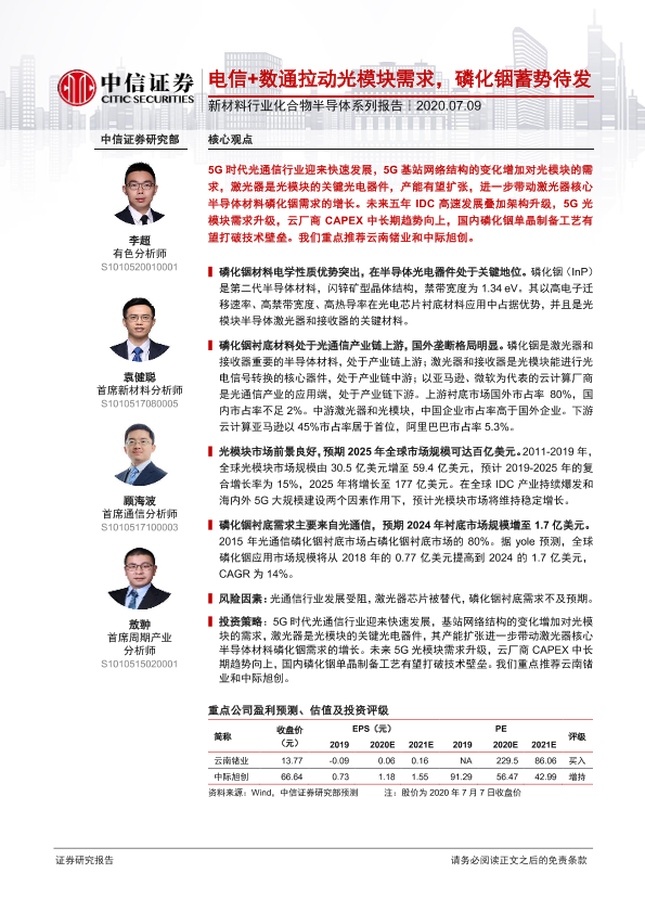 【中信证券】【20200709】20200709-中信证券-新材料行业化合物半导体系列报告:电信+数通拉动光模块需求,磷化铟蓄势待发-22页