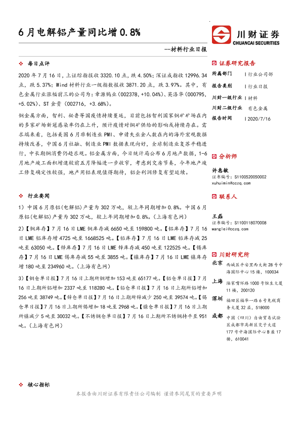 【川财证券】【20200716】6月电解铝产量同比增0.8%-3页