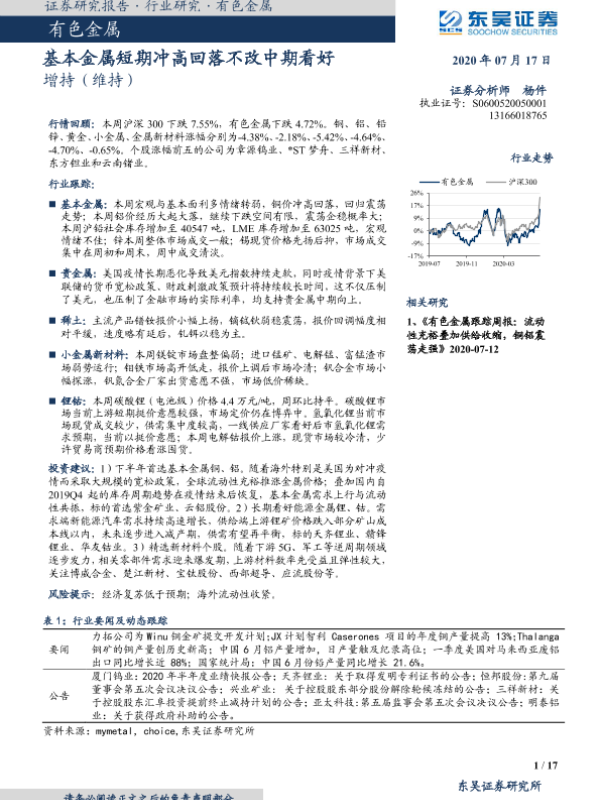 【东吴证券】【20200717】有色金属:基本金属短期冲高回落不改中期看好-17页