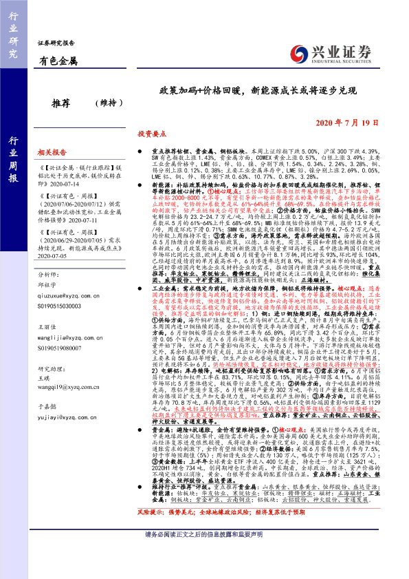 【兴业证券】【20200719】20200719-兴业证券-有色金属行业周报:政策加码+价格回暖,新能源成长或将逐步兑现-12页