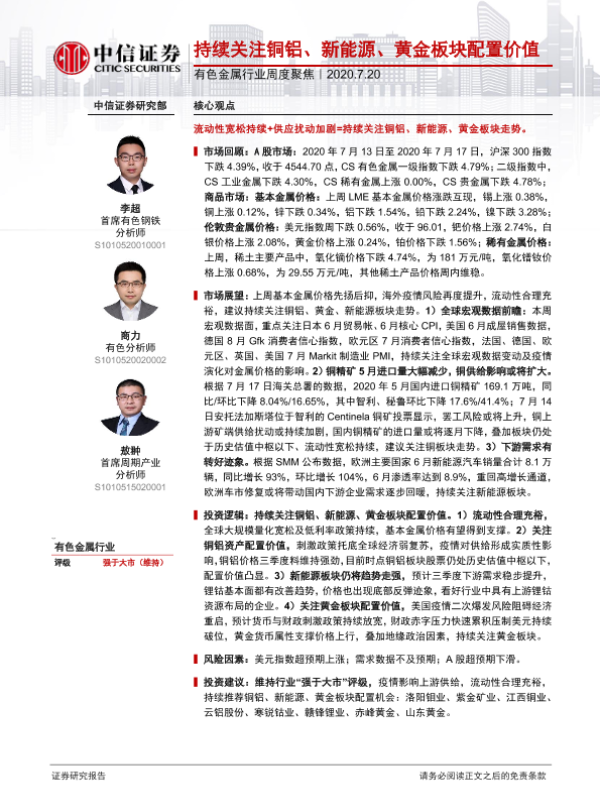 【中信证券】【20200720】20200720-中信证券-有色金属行业周度聚焦:持续关注铜铝、新能源、黄金板块配置价值-18页