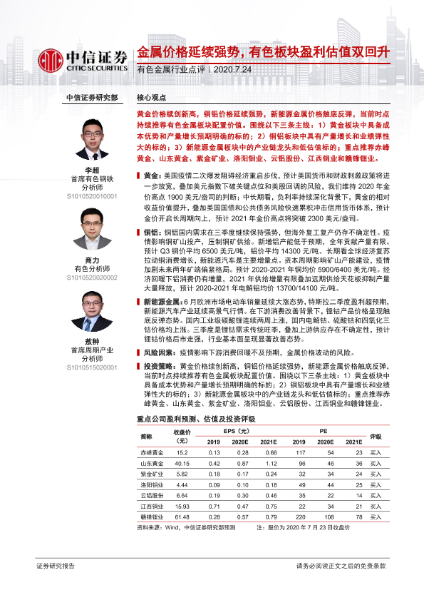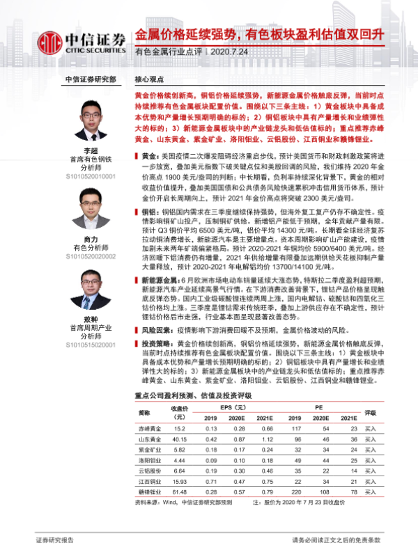 【中信证券】【20200724】20200724-中信证券-有色金属行业点评:金属价格延续强势,有色板块盈利估值双回升-3页