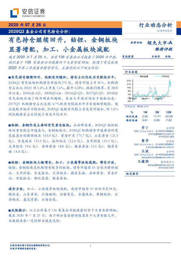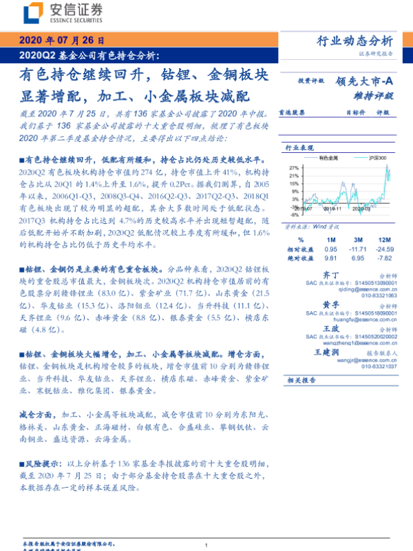 【安信证券】【20200726】2020Q2基金公司有色持仓分析:有色持仓继续回升,钴锂、金铜板块显著增配,加工、小金属板块减配-7页