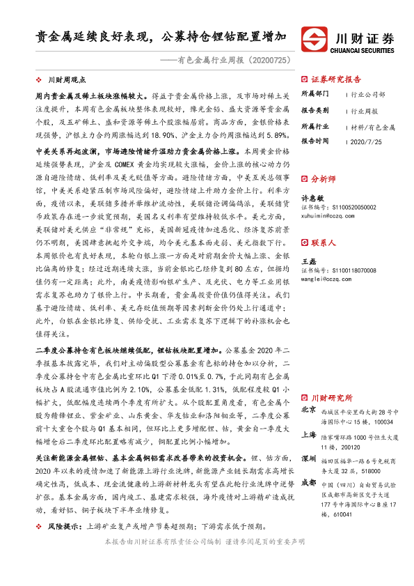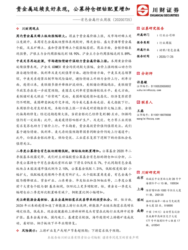 【川财证券】【20200725】20200725-川财证券-有色金属行业周报:贵金属延续良好表现,公募持仓锂钴配置增加-12页