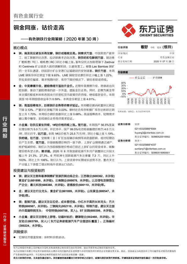【东方证券】【20200726】20200726-东方证券-有色钢铁行业周策略(2020年第30周):铜金同涨,钴价走高-26页
