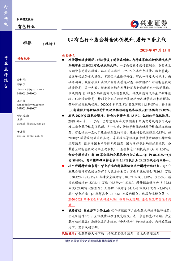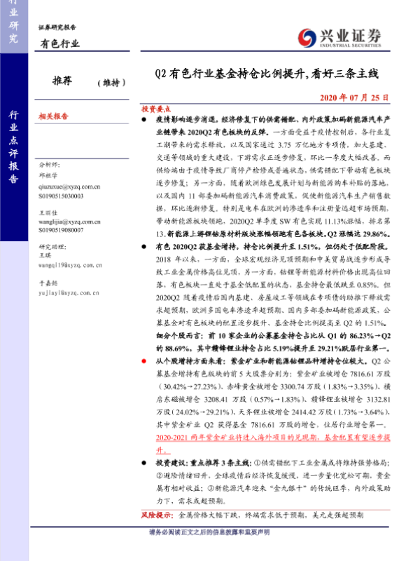 【兴业证券】【20200725】Q2有色行业基金持仓比例提升,看好三条主线-8页