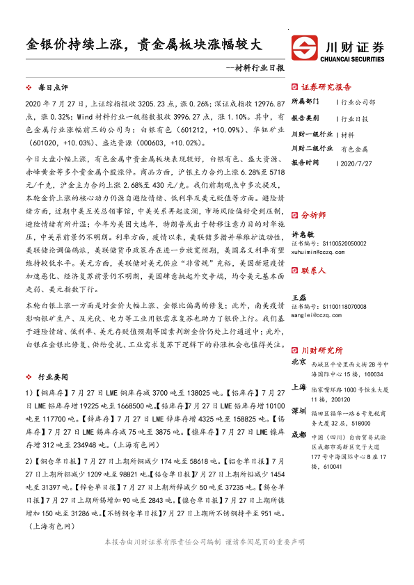 【川财证券】【20200727】材料行业日报:金银价持续上涨,贵金属板块涨幅较大-3页